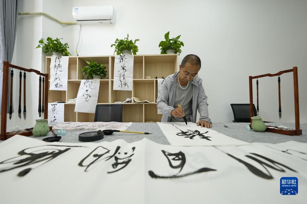 6月8日,一位老人在河北省灤州市灤城街道東南都會社區一家社區養老中心內練習書法。