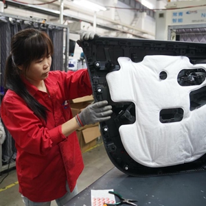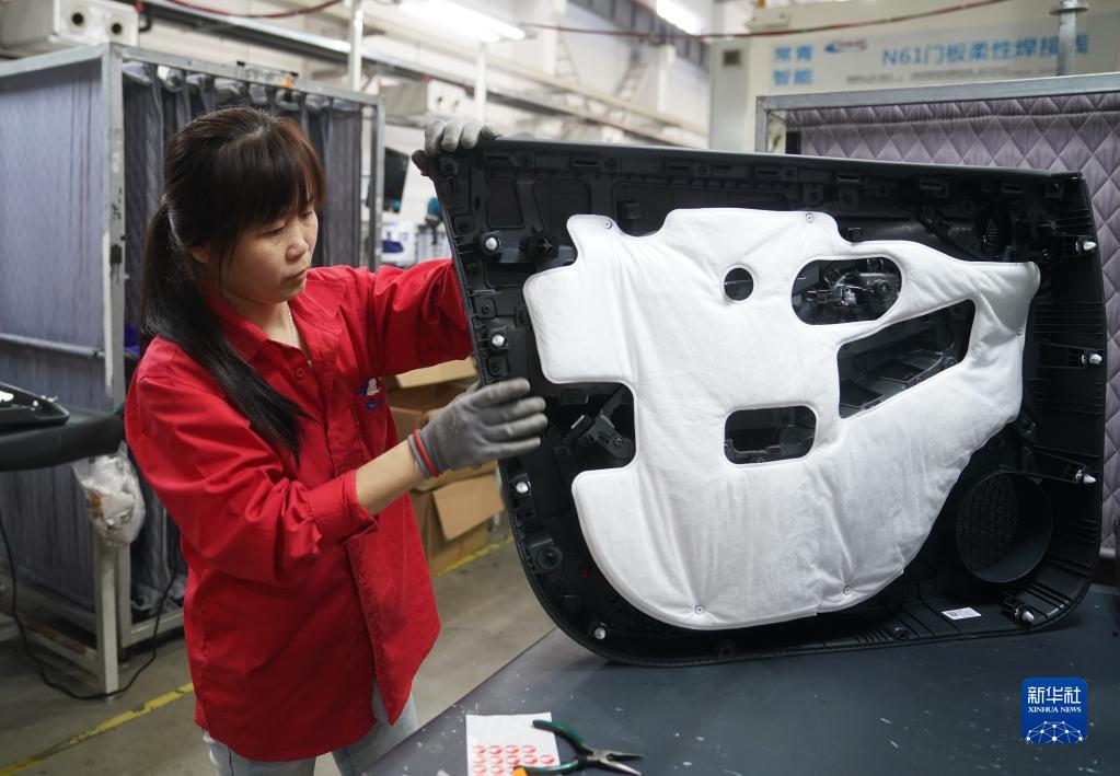 6月7日,在江蘇常熟汽飾集團生產車間,工人在生產汽車門內護板。