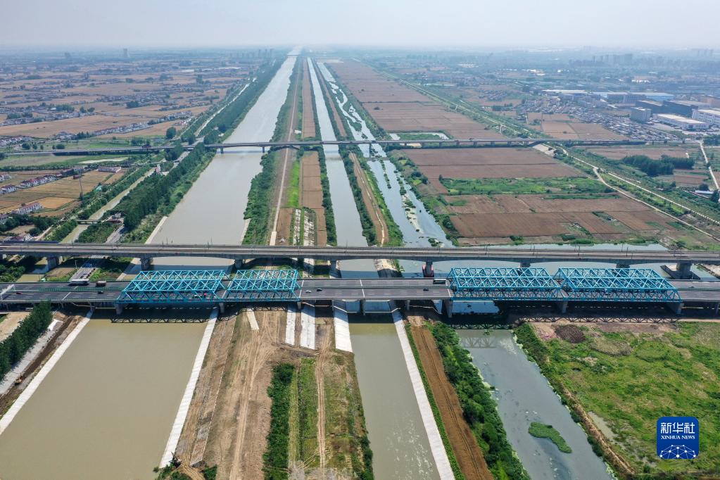 京滬高速公路擴建工程蘇北灌溉總渠大橋現場(6月6日攝,無人機照片)。