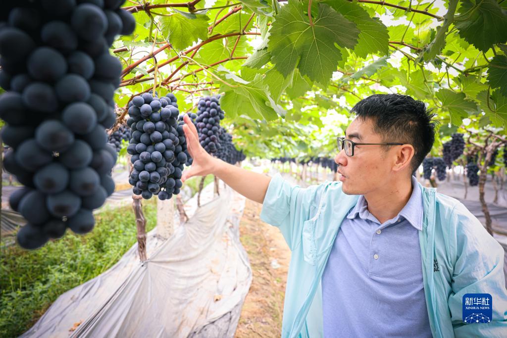 6月8日,江北區農業農村局的農技專家王劍在大棚內查看葡萄的生長情況。
