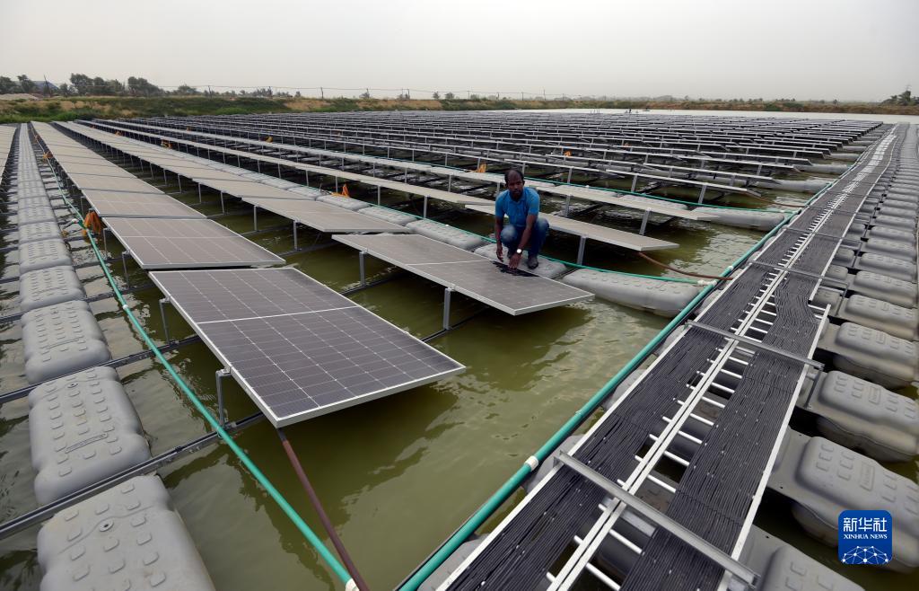 6月5日,在孟加拉國查帕伊諾瓦布甘杰,工作人員檢查水上漂浮太陽能光伏發電站運行情況。
