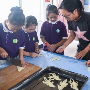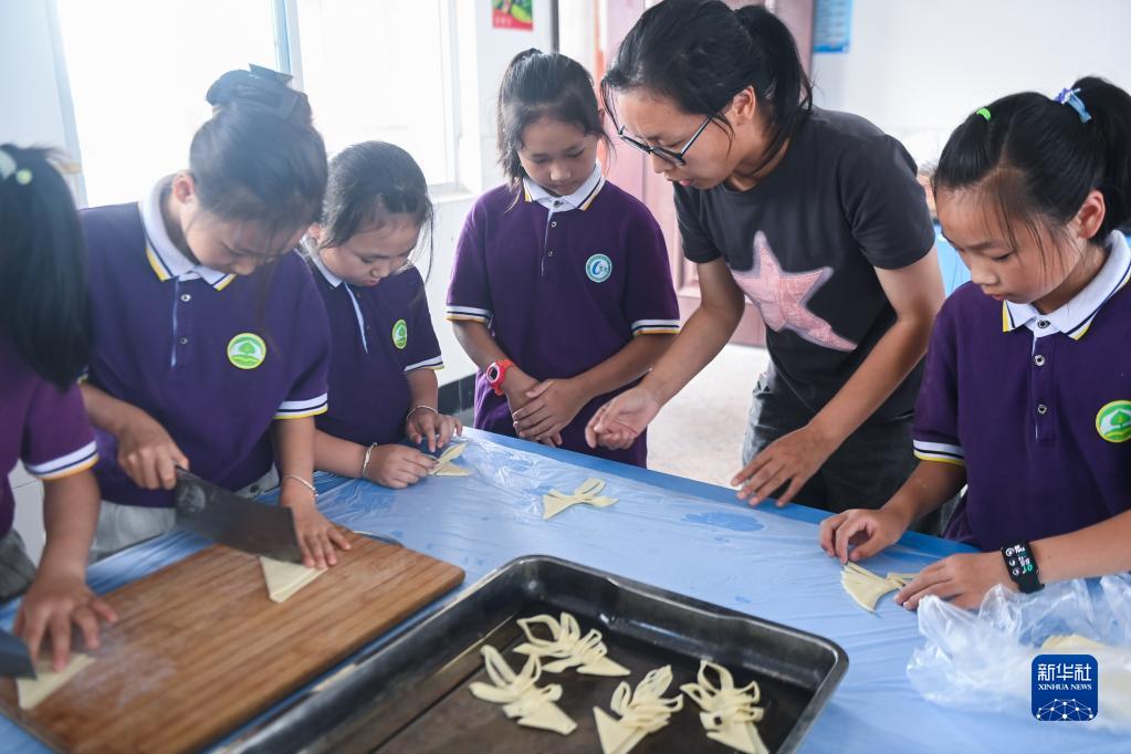 6月8日,學生們在傳統習俗課上學習做當地特色美食——麥花。
