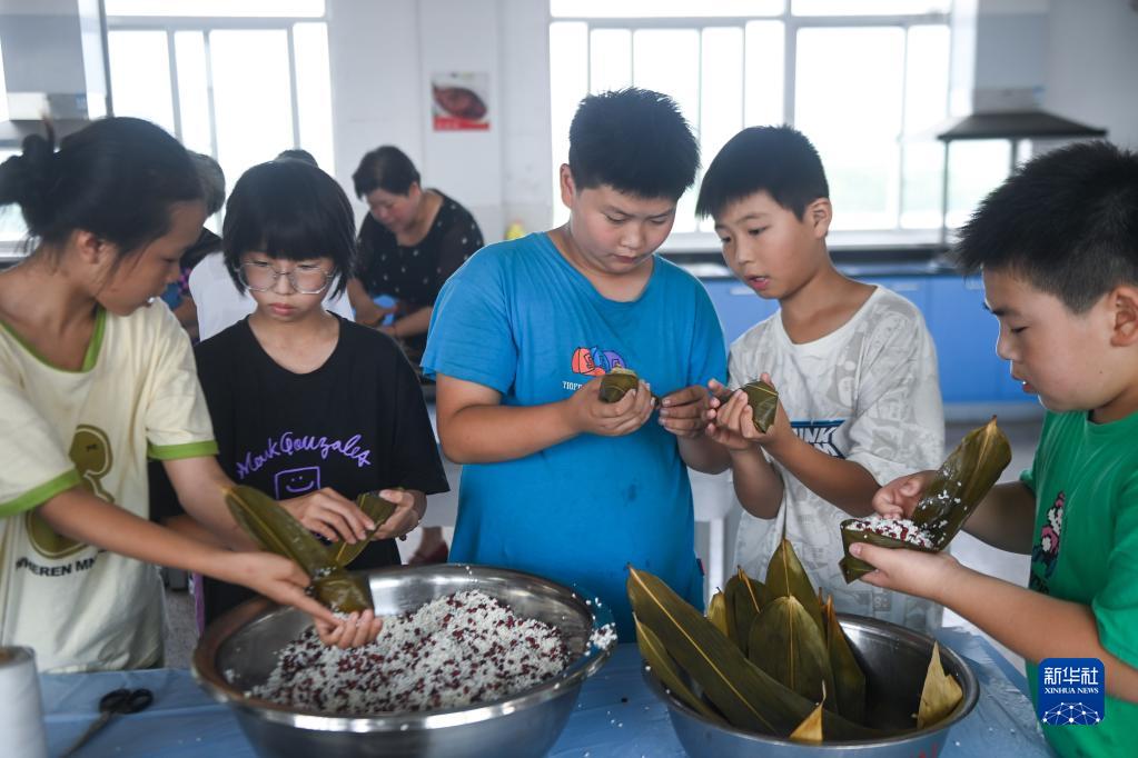 6月8日,學生們在傳統習俗課上學習包粽子。