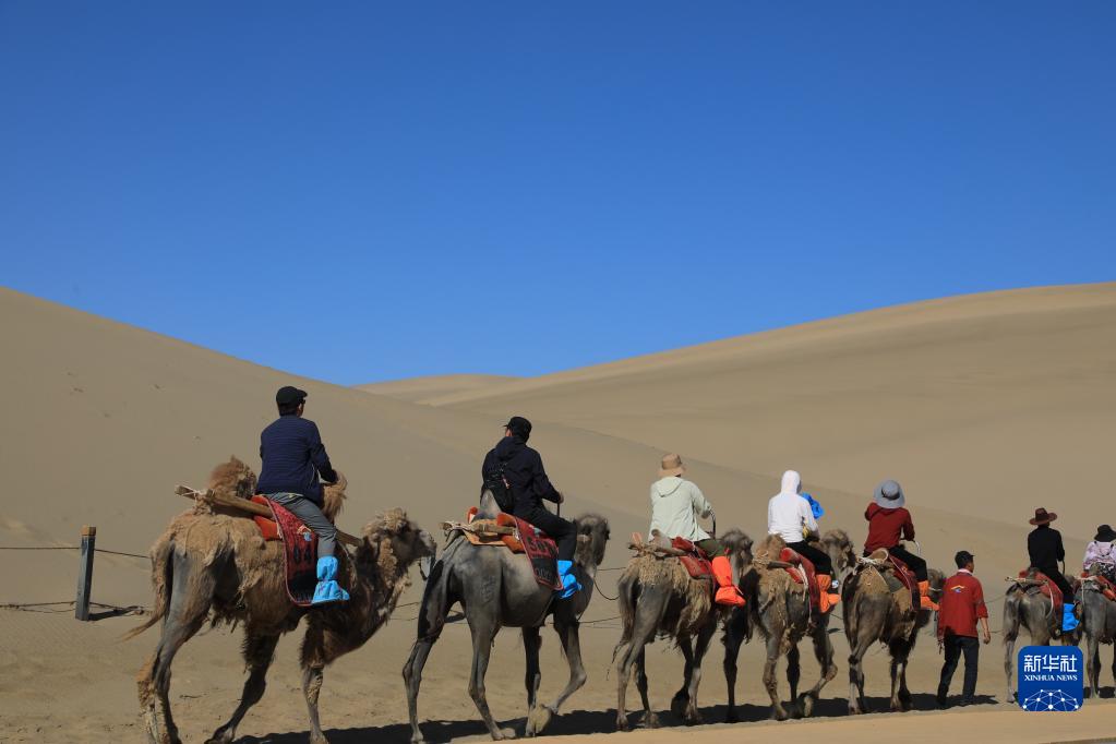 6月7日,在甘肅敦煌鳴沙山月牙泉景區,游客騎乘駱駝感受大漠風光。