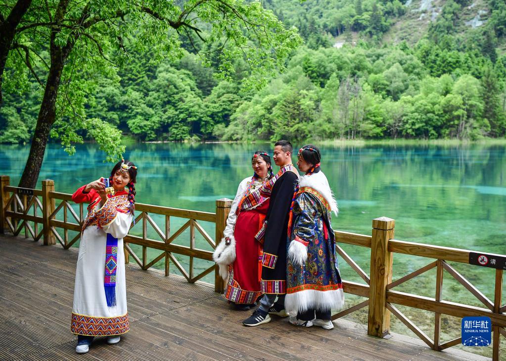 游客身著民族傳統服飾在九寨溝景區拍照留念(6月7日攝)。