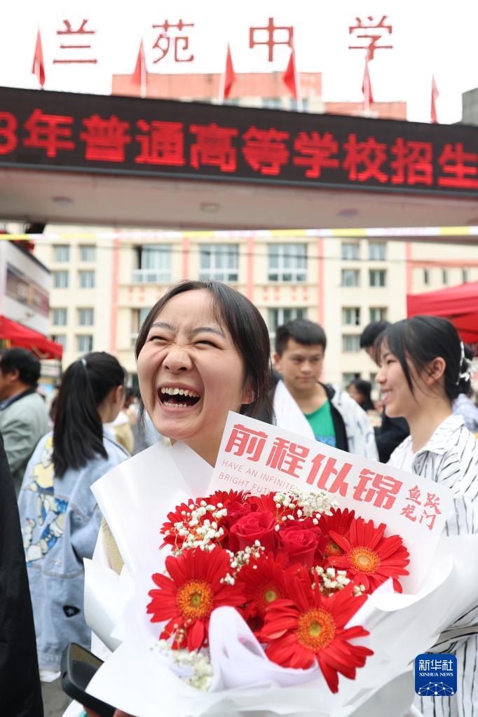 6月8日,在貴州畢節市七星關區蘭苑中學考點,一名考生手捧家長送的鮮花開心大笑。