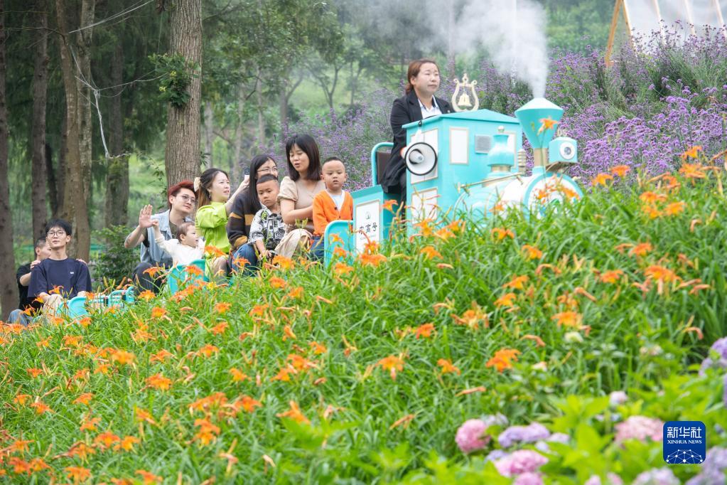 6月8日,游人在黎明古村內搭乘觀光小火車游玩。