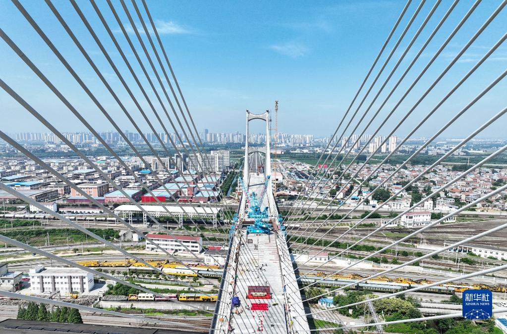 6月8日,中鐵十一局施工機械將襄陽北編組站大橋的最后一段鋼主梁吊裝到位。
