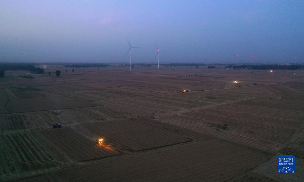 6月7日晚,收割機在袁營村搶收(無人機照片)。