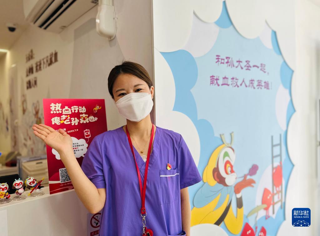 6月8日,“熱血悟空”主題獻血屋的采血護士在介紹獻血屋內的特色墻繪和裝飾。