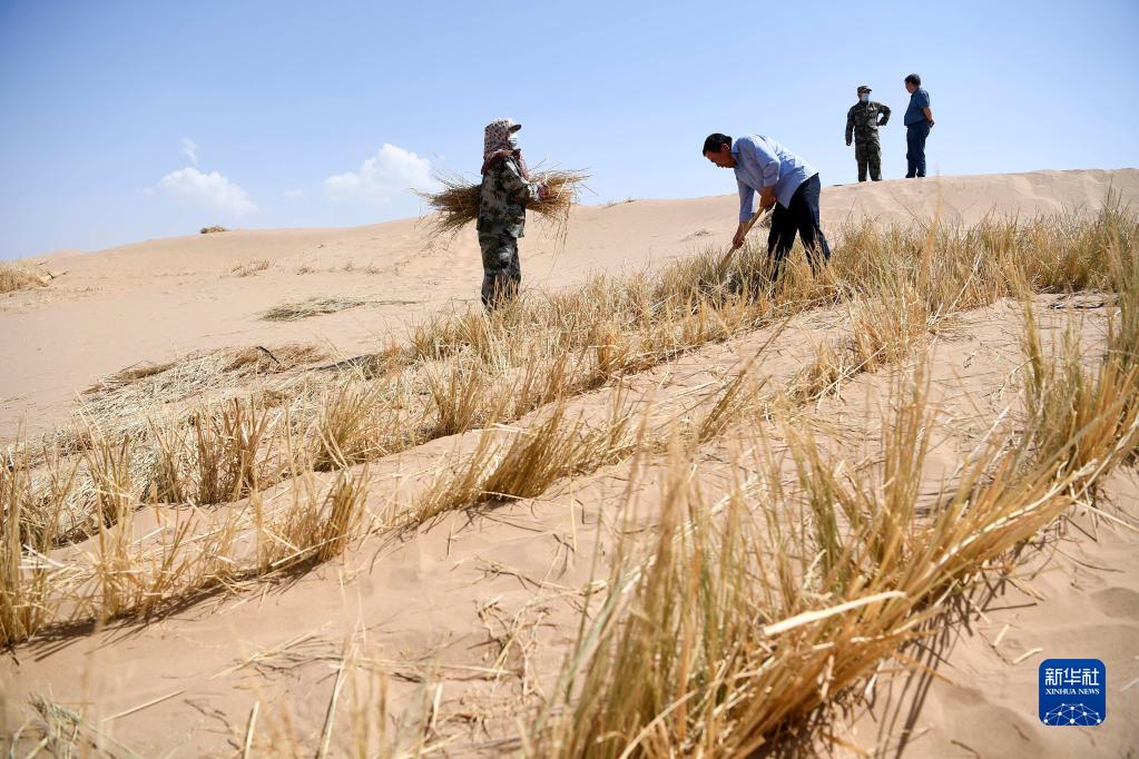 工作人員在白芨灘國家級自然保護區補扎草方格(6月7日攝)。