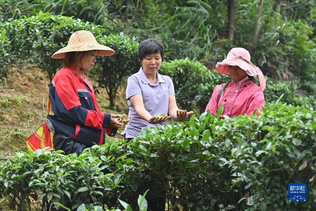 6月7日,在蒼梧縣六堡鎮山坪村,祝雪蘭(中)和村民們在采茶。