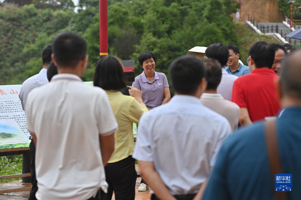 6月7日,在蒼梧縣六堡鎮山坪村,祝雪蘭向來訪者介紹六堡茶文化和茶產業發展情況。