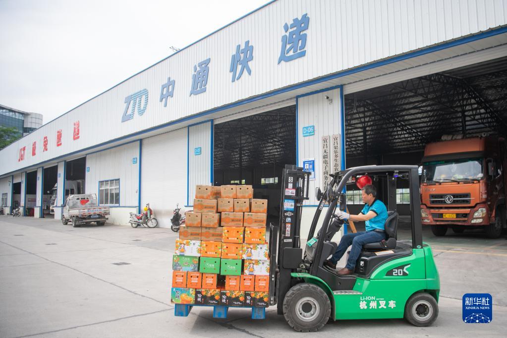6月8日,在秭歸縣華維電商物流園區內,工作人員運輸即將發貨的臍橙。