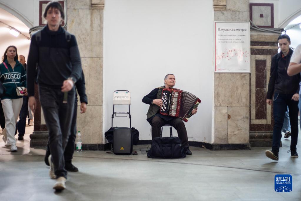6月6日,在俄羅斯首都莫斯科,一名巴揚演奏家在地鐵站內表演。