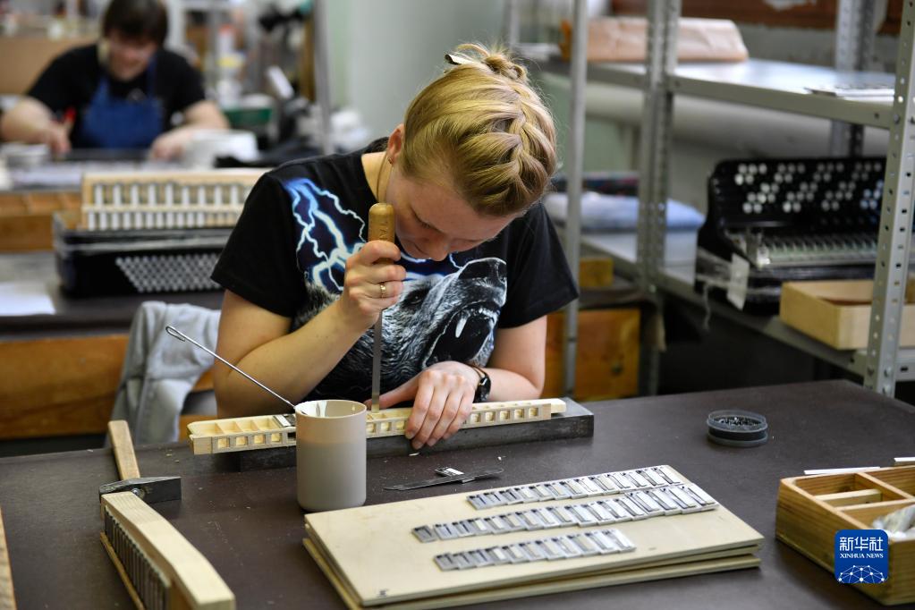 6月7日,工作人員在俄羅斯圖拉組裝巴揚手風琴。