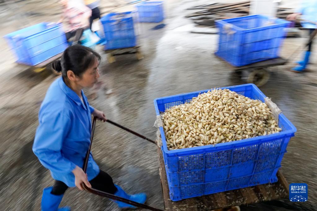 6月8日,在豐都藠頭出口龍頭企業重慶豐都明富實業有限公司的加工車間,一名工人轉運初洗后的藠頭。