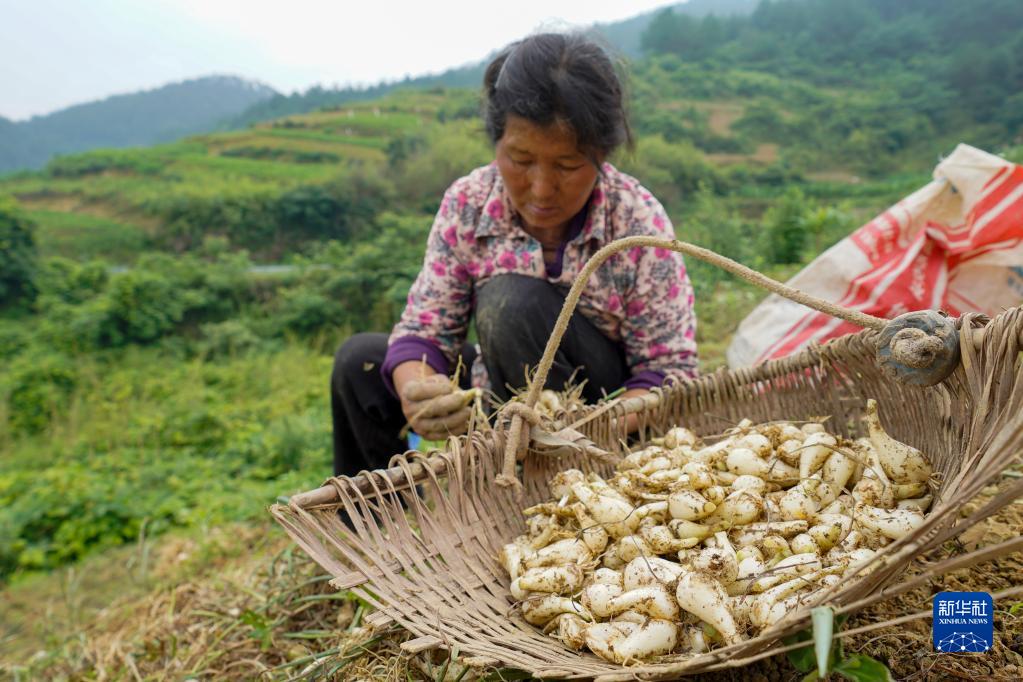 6月8日,在豐都縣高家鎮金家坪村的藠頭田,當地村民在采收藠頭。
