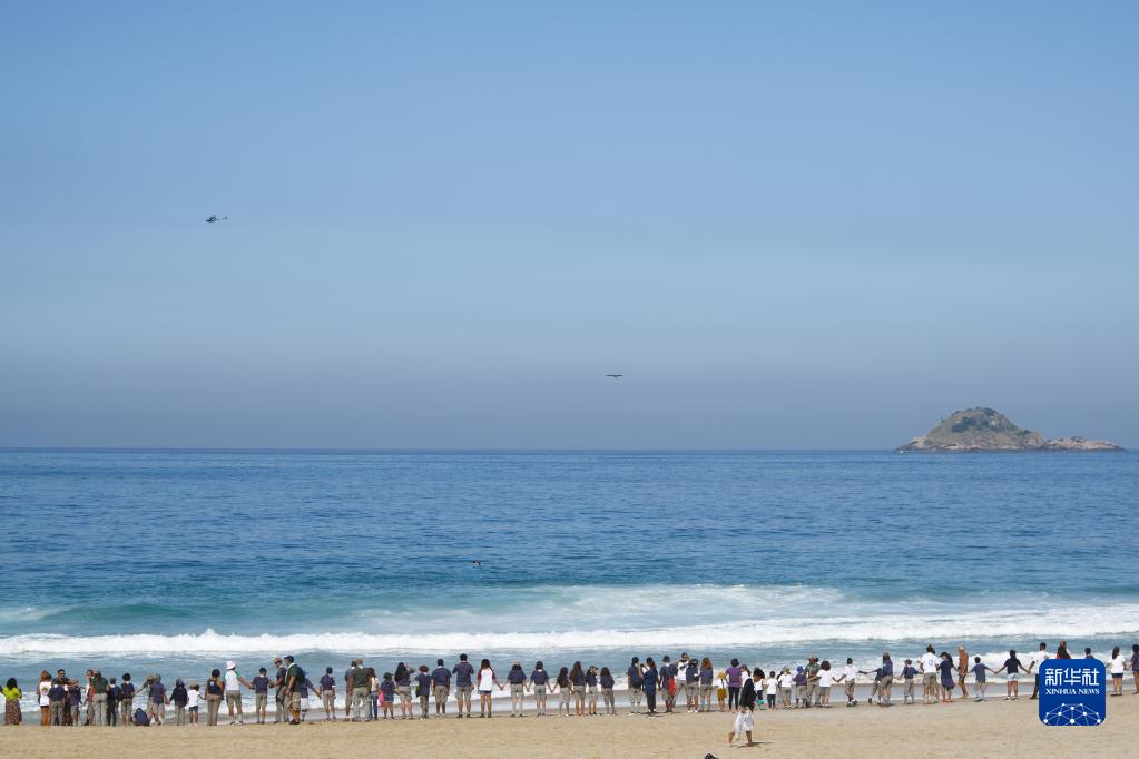 6月8日,在巴西里約熱內盧圣孔拉杜海灘,志愿者手拉手“擁抱”海洋。