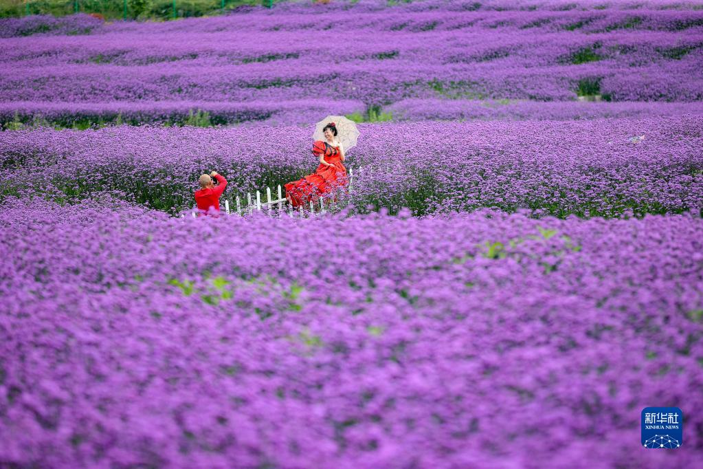 6月9日,游人在貴州省貴陽市花溪區高坡苗族鄉石門村馬鞭草花海中游玩拍照。