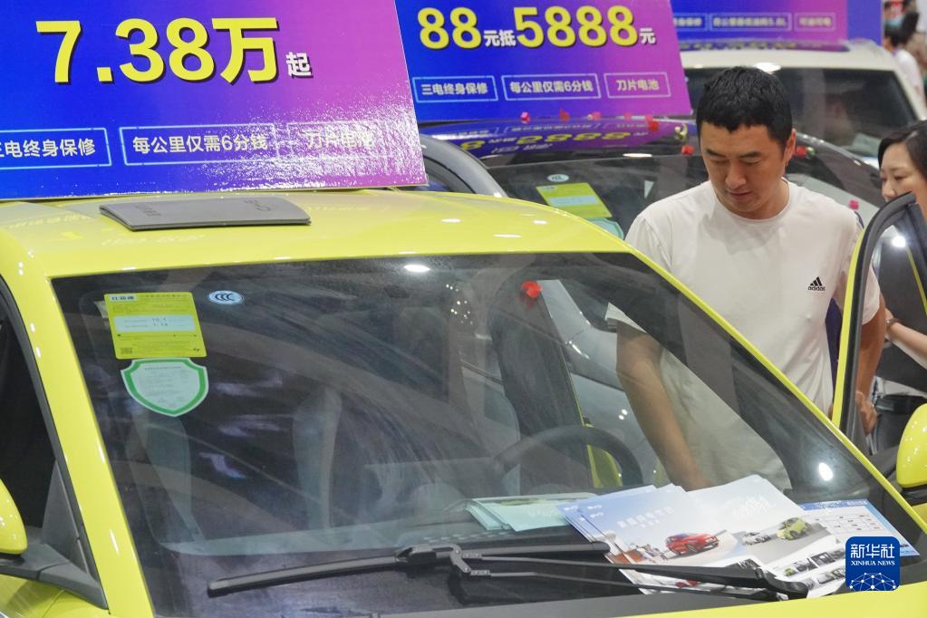 6月9日,消費者在山東煙臺夏季惠民車展上了解參展汽車。