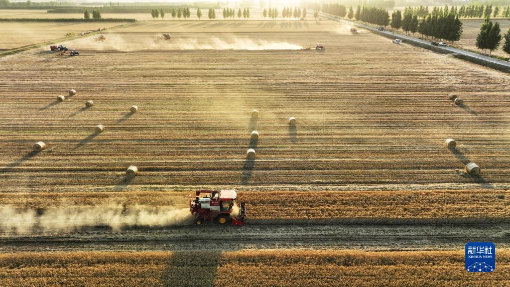 6月8日,山東省臨沂市郯城縣興軍農機化服務農民專業合作社農機手駕駛機械在郯城街道前趙村進行麥收和秸稈回收一體化作業(無人機照片)。