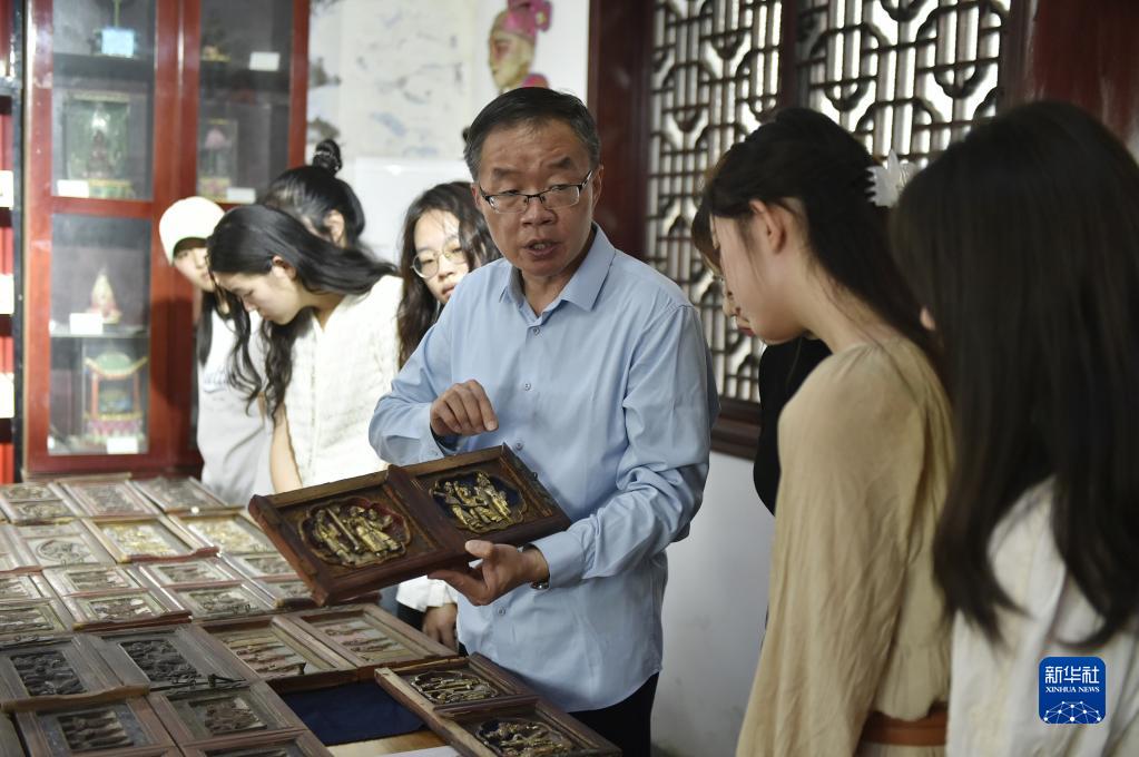 6月7日,張俊濤在開封市“汴京燈籠張”彩燈展覽館內向來訪的大學生們介紹自己收集的家用傳統木雕。