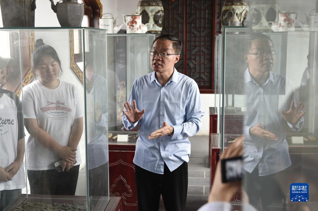 6月7日,張俊濤在開封市“汴京燈籠張”彩燈展覽館內向來訪的大學生們介紹彩燈制作技藝。