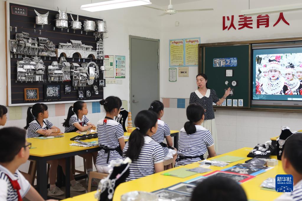 苗族銀飾鍛制技藝是苗族喜愛的民間傳統工藝,主要用于制作頭飾、面飾、頸飾、手飾等苗族飾品。近年來,在湖南省文化館(湖南省非物質文化遺產保護中心)的支持下,長沙市朝陽小學開設“無銀無花不成美”特色美育課程,教授苗族銀飾的歷史淵源、造型特點、主要分類、工藝流程、服飾搭配技巧等,學生們在課堂上可以利用錫箔紙、易拉罐、零食包裝袋等生活中便于獲取的材料制作有苗族銀飾特色的手工作品,讓學生們在對苗族銀飾的欣賞與制作中,感受非遺之美,傳承優秀的傳統文化。
