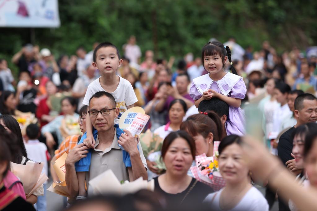 6月9日,在湖南省懷化市通道侗族自治縣第一中學考點,家長帶孩子等待哥哥姐姐走出校園。
