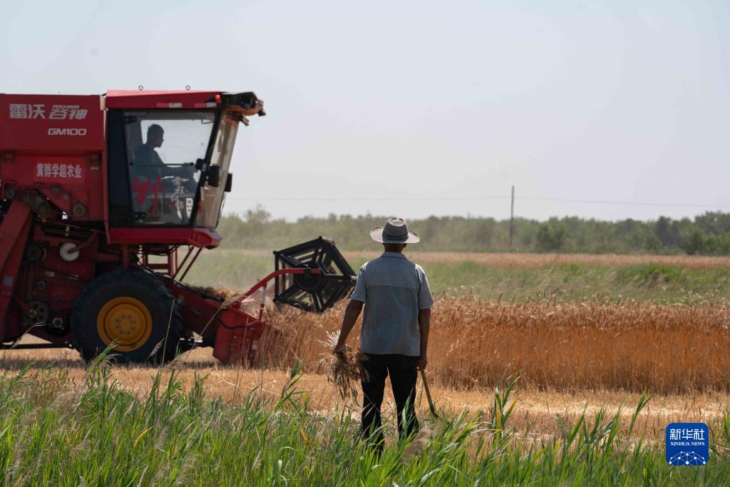 6月9日,在河北滄州渤海新區黃驊市后仙莊旱堿麥田里,聯合收割機在搶收小麥。
