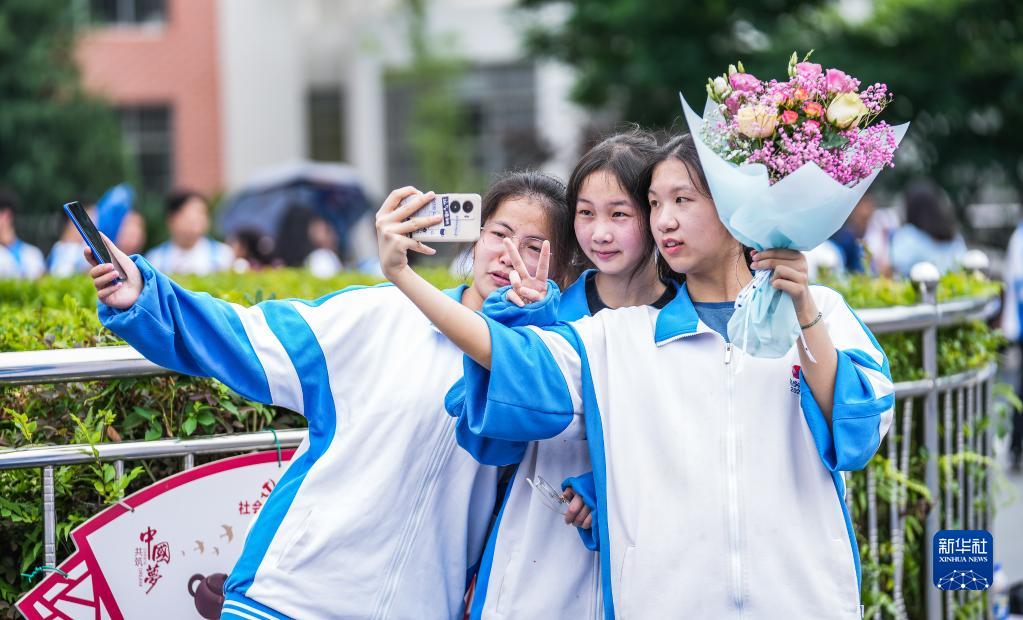 6月9日,烏當中學高三學生在校園廣場自拍留念。