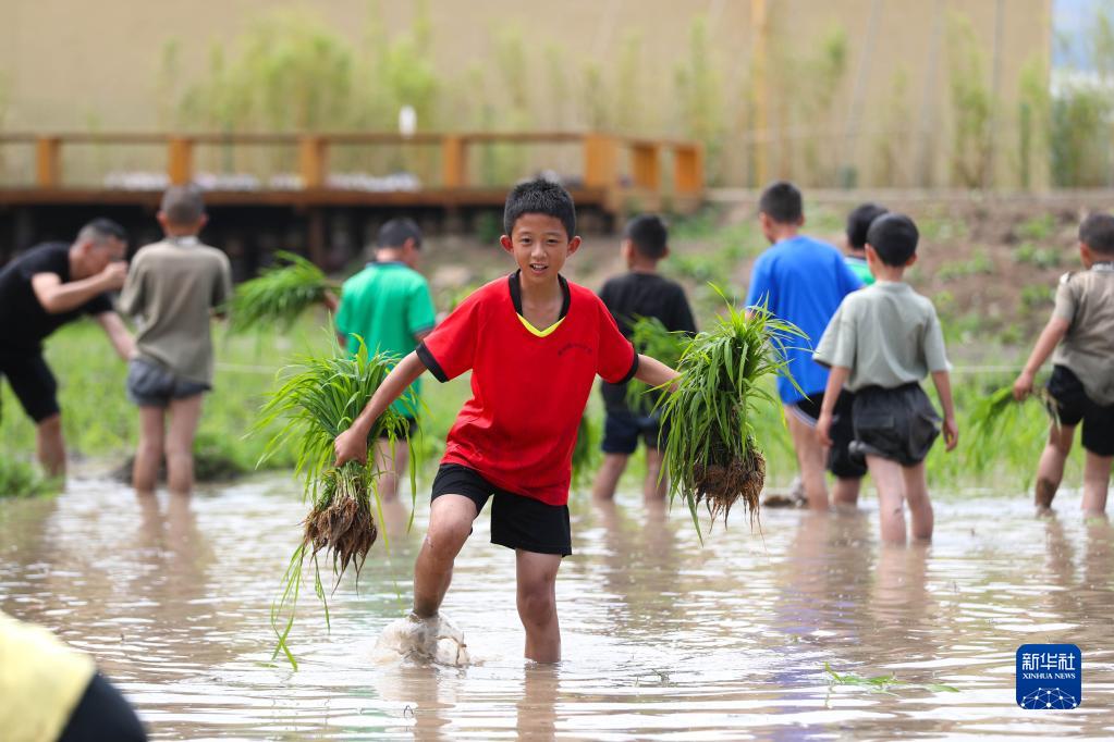 6月9日,學生在貴州省綏陽縣中小學勞動教育綜合實踐基地體驗插秧。
