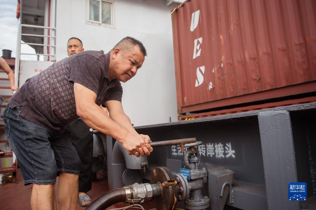 6月8日,一艘待閘船舶上的船員打開生活污水轉岸接頭開關,排放生活污水至污染物接收轉運船上。