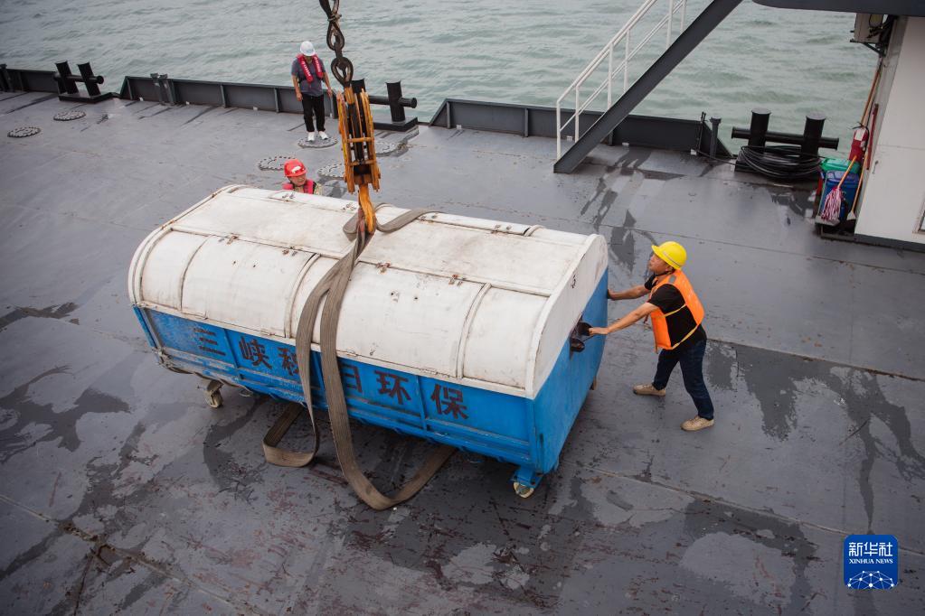 6月8日,浮吊作業躉船對船舶生活垃圾進行接收轉運處置。