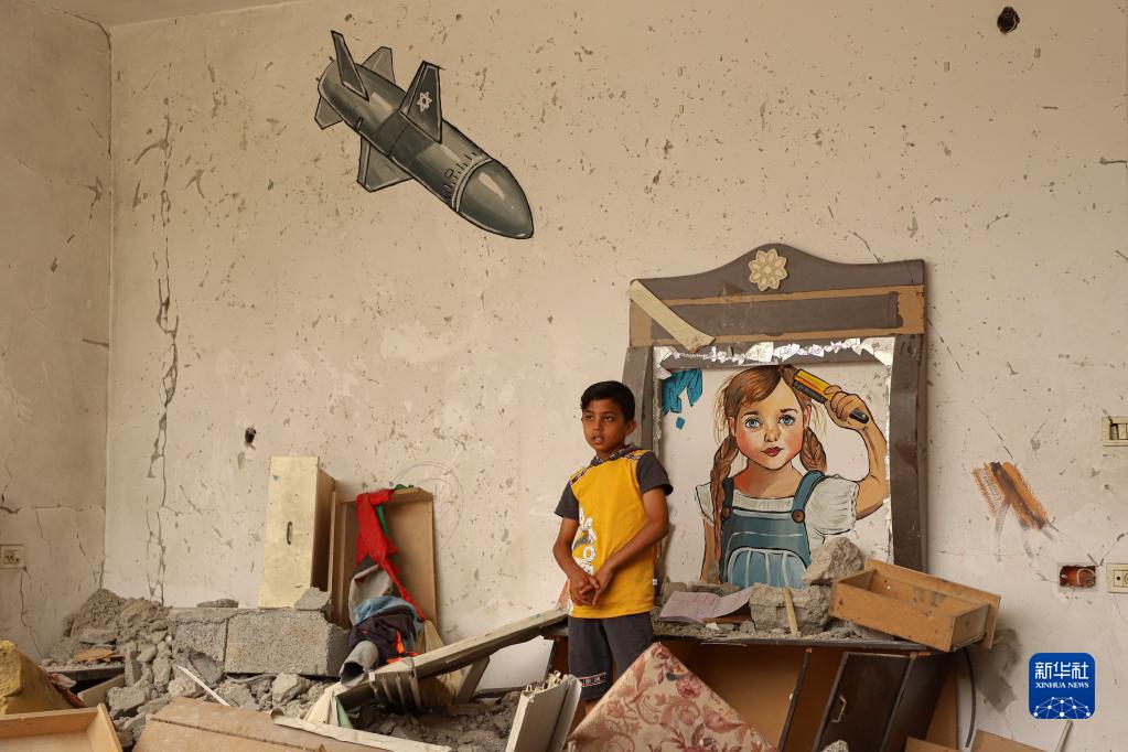 6月8日,兒童在加沙地帶中部一處難民營附近畫有涂鴉的廢墟玩耍。