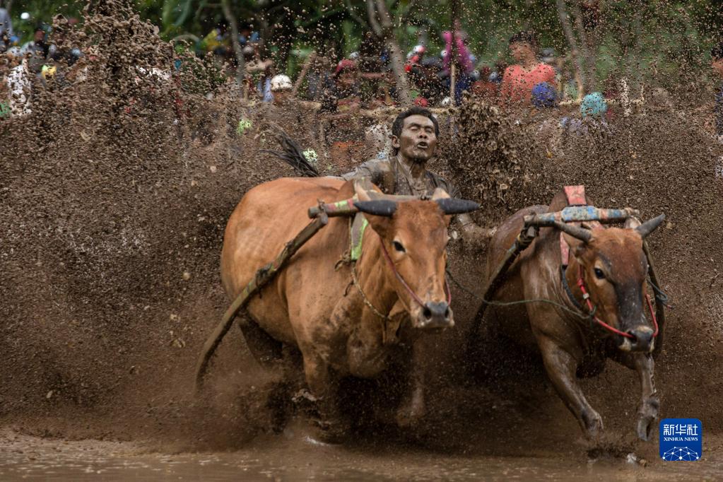 當地人們在水稻田里舉辦奔牛比賽慶祝豐收。
