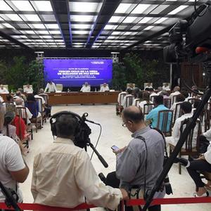 這是6月9日在古巴首都哈瓦那拍攝的哥倫比亞政府與反政府武裝“哥倫比亞民族解放軍”第三輪和談閉幕式現場。