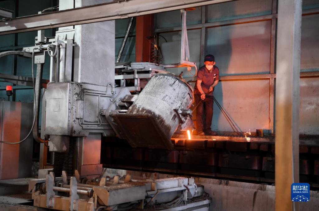 6月9日,河北滄州泊頭市亞奇鑄業有限公司工人在進行澆鑄作業。