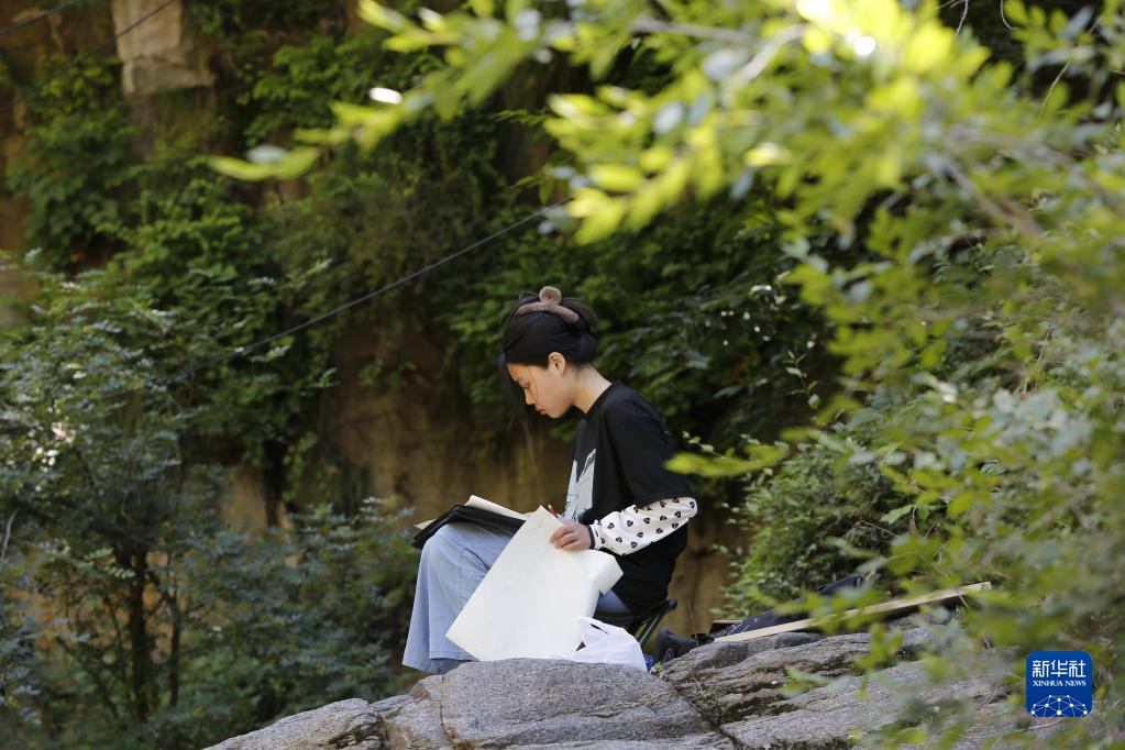 6月9日,學生在河南安陽林州市石板巖鎮三畝地村寫生。