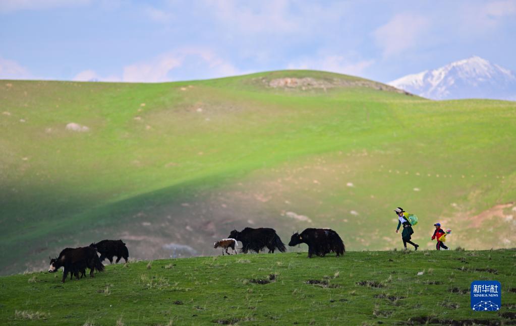 6月9日,在青海省黃南藏族自治州澤庫縣的高原草原上,當地牧民在放牧。
