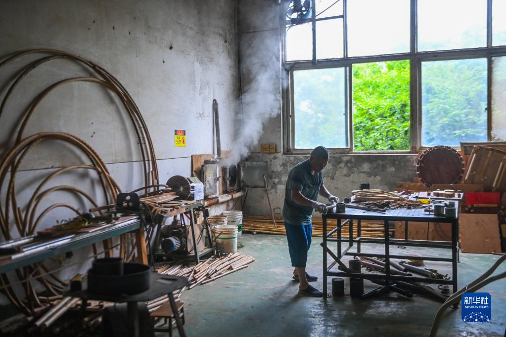 在位于杭州拱墅區的杭州昌盛藤器廠內,工人正在手工加工藤條,通過熱彎塑形制作傳統藤器(6月7日攝)。這個廠生產的傳統藤編制品通過自然造物文化創意團隊在多地的民間手工藝文化空間進行展示推廣。