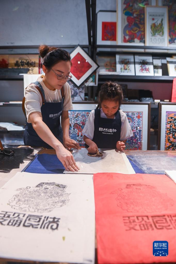 在位于杭州瓶窯老街的自然造物民藝研究中心內,工作人員帶著孩子們在體驗木版年畫拓印技藝(5月28日攝)。該中心是占地3500多平方米的民間手工藝文化空間,集中展示來自全國二十多個省份數千種手工藝產品。顧客也可以在這里體驗包括木版年畫拓印、泥塑彩繪、油紙傘制作、竹編燈籠、刺繡等非遺技藝。