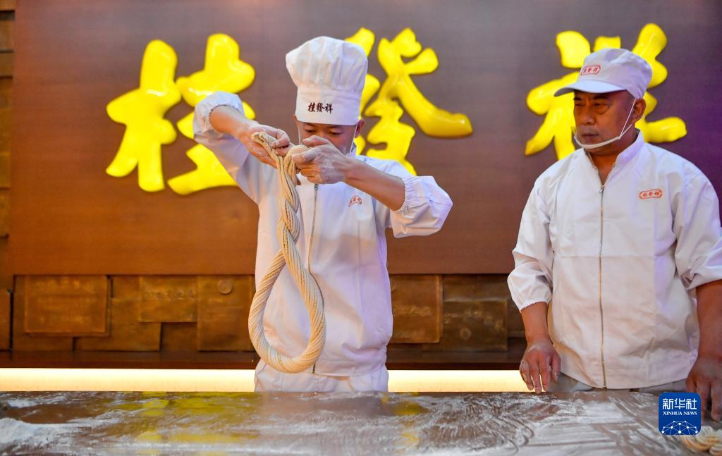 在天津桂發祥十八街麻花文化館,徒弟趙寶陽在王洪德(右)的指導下搓制手工麻花(6月8日攝)。
