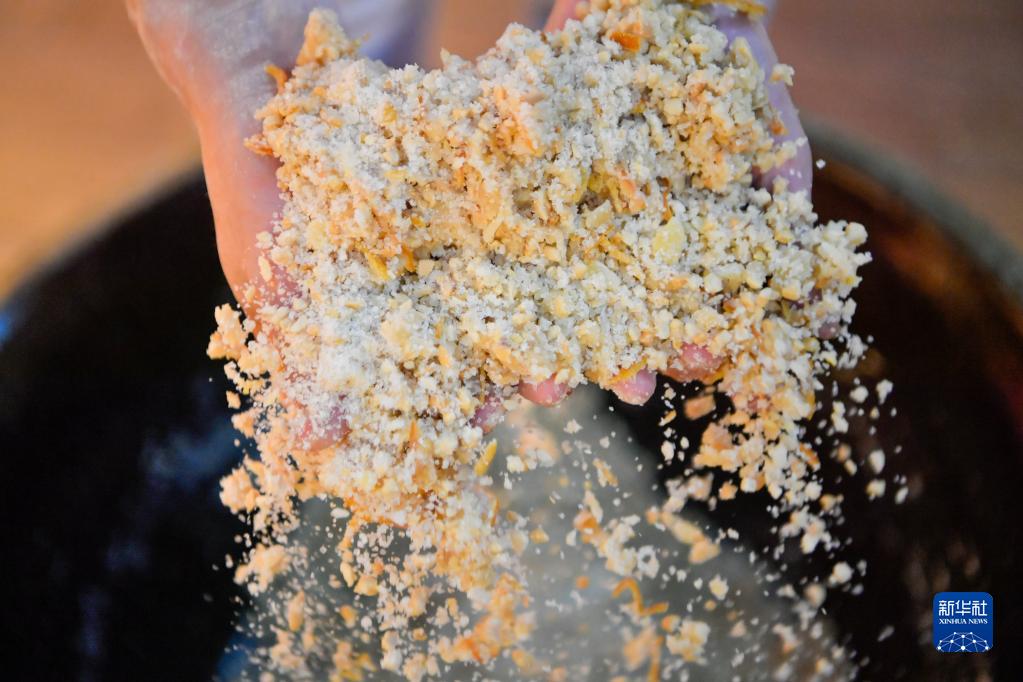 在天津桂發祥十八街麻花文化館,趙寶陽為手工麻花制作準備餡料(6月8日攝)。