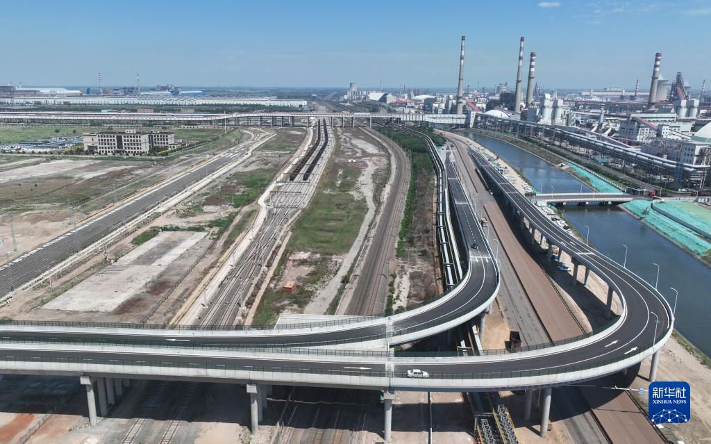 6月10日,車輛從河北省唐山市海港經濟開發區文化大街跨鐵路專線立交橋上通過(無人機照片)。