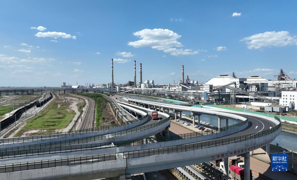 6月9日,車輛從河北省唐山市海港經濟開發區文化大街跨鐵路專線立交橋上通過(無人機照片)。
