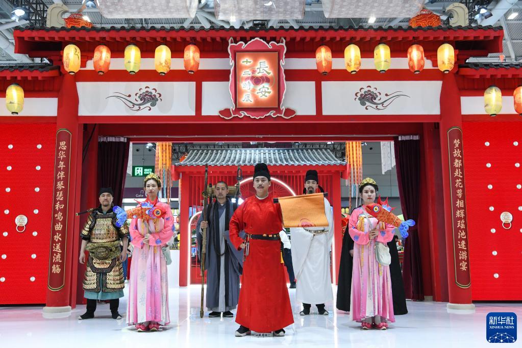 6月9日,在文博會“文旅消費館·一帶一路國際館”陜西展臺,身著古裝的工作人員歡迎觀眾的到來。