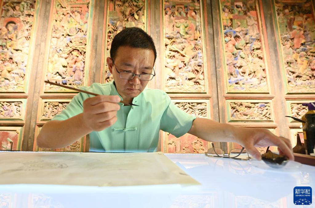 霍樹林在天津市西青區的楊柳青霍氏古一張畫店準備進行勾線(6月6日攝)。