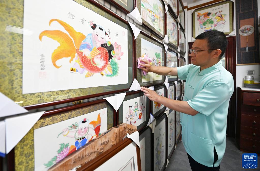 在天津市西青區的楊柳青霍氏古一張畫店,霍樹林在用布擦拭畫框(6月6日攝)。